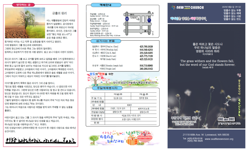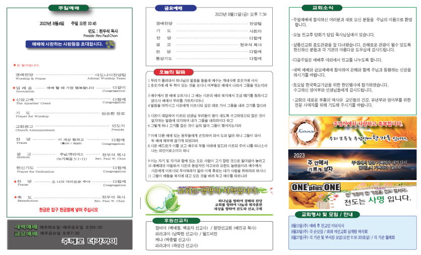 2023년8월6일 주보안내 페이지 정보 작성자 뉴비전교회 조회 383회 작성일 23-08-12 19:21 목록 본문 2023년8월6일 주보안내 이전글2023년8월13일 주보안내 23.08.12 다음글2023년7월30일 주보안내 23.08.12