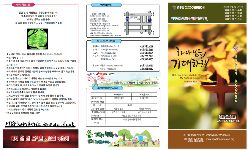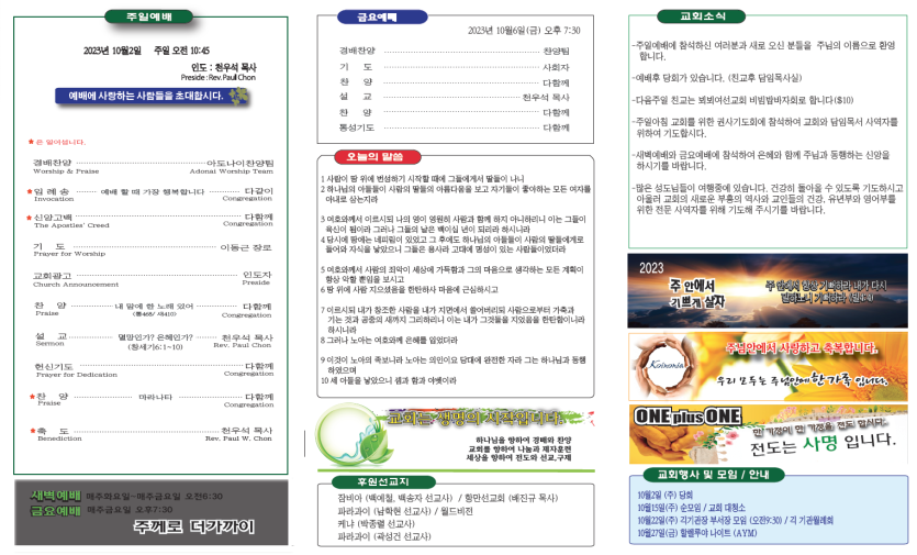 2023년10월1일 주보안내 페이지 정보 작성자 뉴비전교회 조회 385회 작성일 23-09-30 21:55 목록 본문 2023년10월1일 주보안내 이전글2023년10월8일 주보안내 23.10.29 다음글2023년9월24일 주보안내 23.09.30
