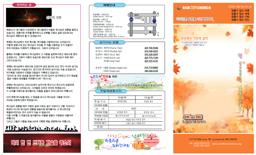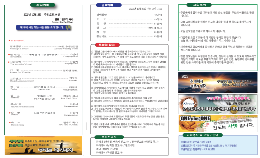 2023년10월15일 주보안내 페이지 정보 작성자 뉴비전교회 조회 349회 작성일 23-10-29 08:38 목록 본문 2023년10월15일 주보안내 이전글2023년10월22일 주보안내 24.01.01 다음글2023년10월8일 주보안내 23.10.29