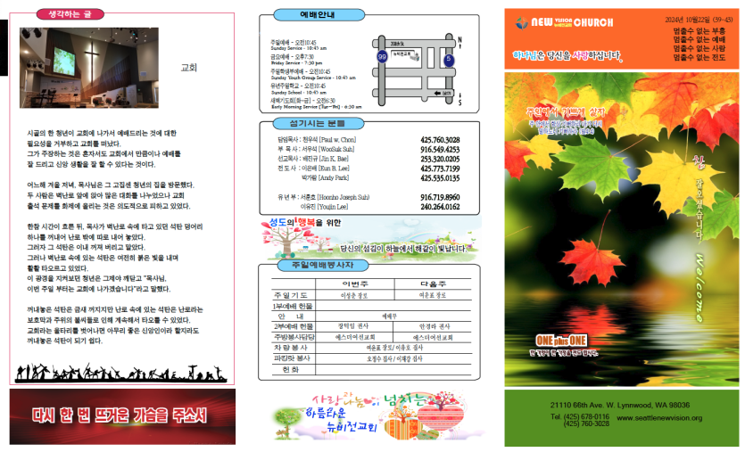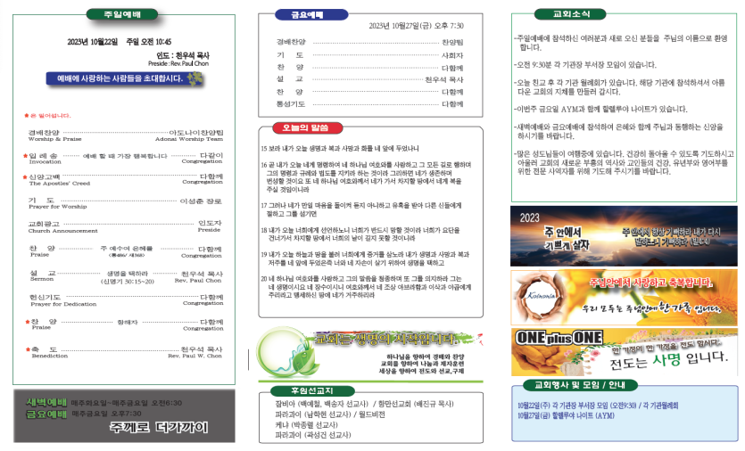 2023년10월22일 주보안내 페이지 정보 작성자 뉴비전교회 조회 320회 작성일 24-01-01 10:06 목록 본문 2023년10월22일 주보안내 이전글2023년10월29일 주보안내 24.01.01 다음글2023년10월15일 주보안내 23.10.29