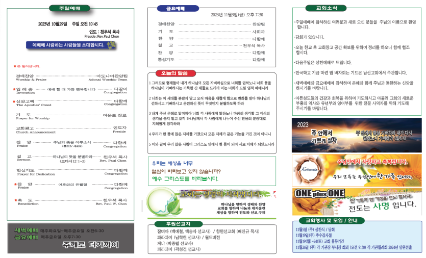 2023년10월29일 주보안내 페이지 정보 작성자 뉴비전교회 조회 276회 작성일 24-01-01 10:09 목록 본문 2023년10월29일 주보안내 이전글2023년11월5일 주보안내 24.01.01 다음글2023년10월22일 주보안내 24.01.01