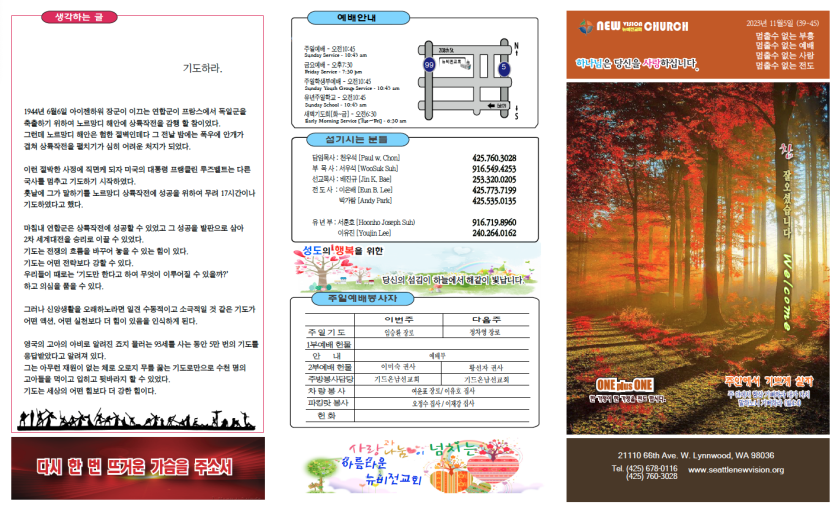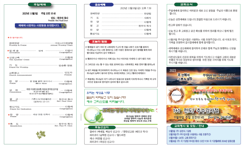 2023년11월5일 주보안내 페이지 정보 작성자 뉴비전교회 조회 303회 작성일 24-01-01 10:11 목록 본문 2023년11월5일 주보안내 이전글2023년11월12일 주보안내 24.01.01 다음글2023년10월29일 주보안내 24.01.01