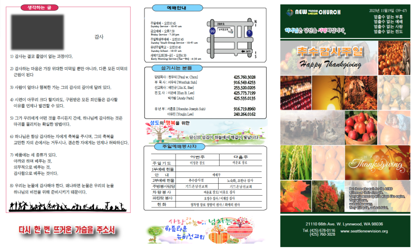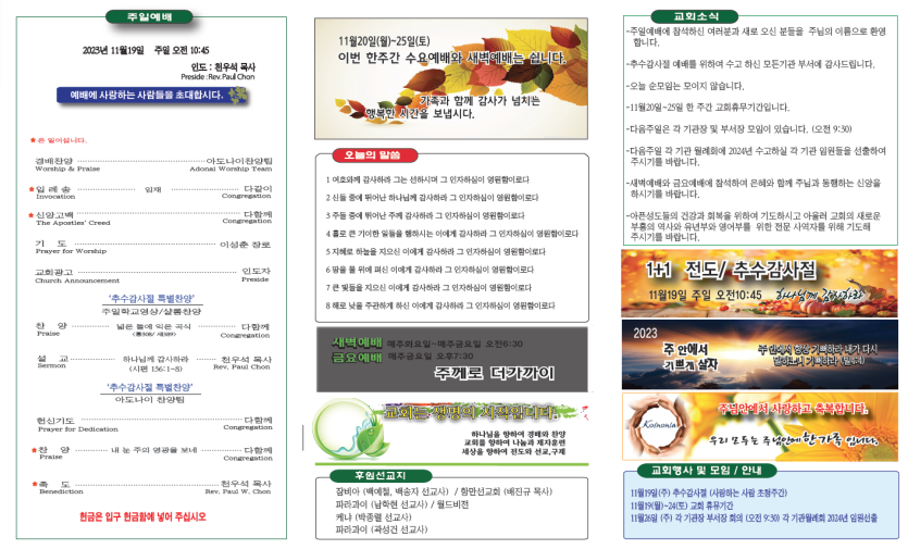 2023년11월19일 주보안내 페이지 정보 작성자 뉴비전교회 조회 316회 작성일 24-01-01 10:14 목록 본문 2023년11월19일 주보안내 이전글2024년 1월 21일 주보 24.01.29 다음글2023년11월12일 주보안내 24.01.01