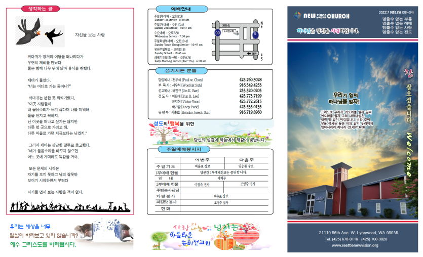 2022년9월11일 주보안내 페이지 정보 작성자 뉴비전교회 조회 511회 작성일 22-09-18 08:11 목록 본문 2022년9월11일 주보안내 이전글2022년9월18일 주보안내 22.09.18 다음글2022년9월4일 주보안내 22.09.03