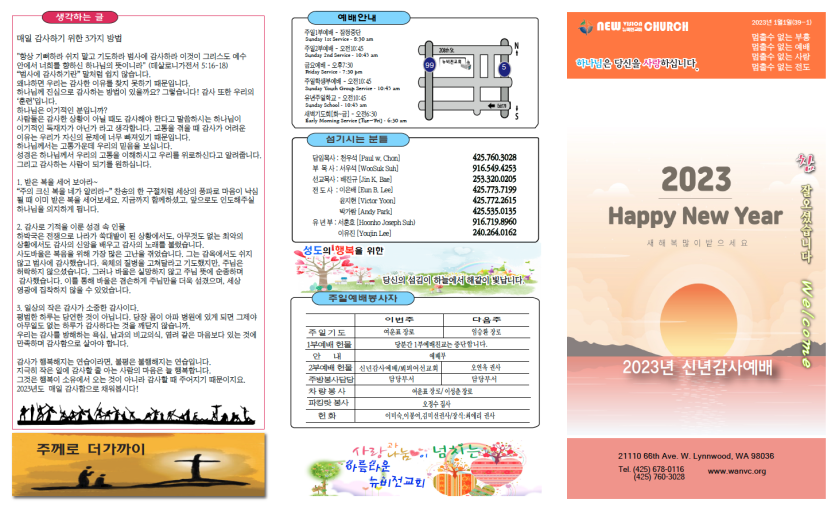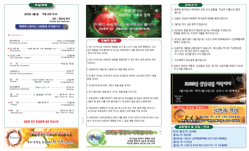 2023년1월1일 주보안내 페이지 정보 작성자 뉴비전교회 조회 411회 작성일 23-01-15 08:40 목록 본문 2023년1월1일 주보안내 이전글2023년1월8일 주보안내 23.01.15 다음글2022년11월27일주보안내 22.12.03