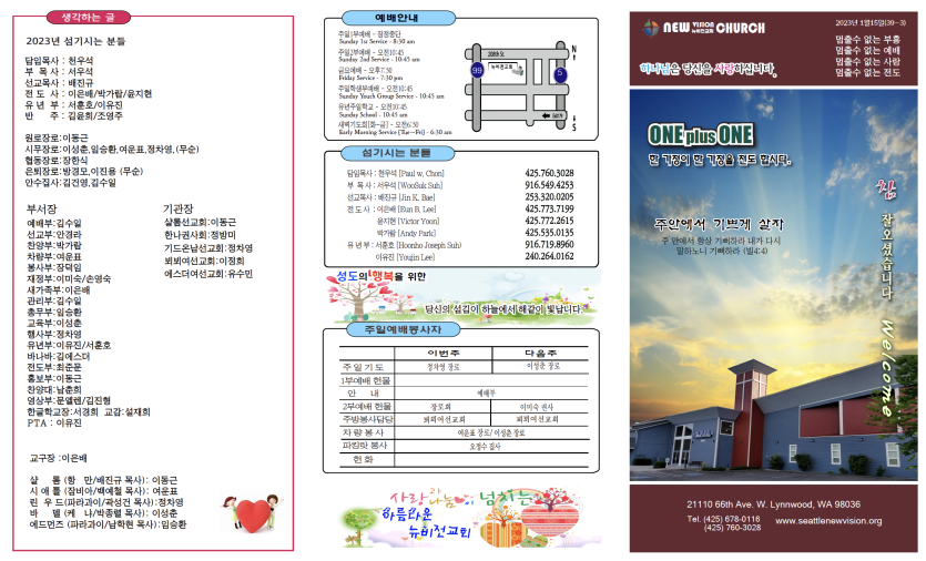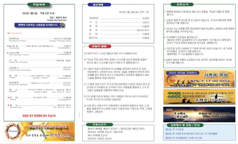 2023년1월15일 주보안내 페이지 정보 작성자 뉴비전교회 조회 453회 작성일 23-01-30 08:19 목록 본문 2023년1월15일 주보안내 이전글2023년1월22일 주보안내 23.01.30 다음글2023년1월8일 주보안내 23.01.15