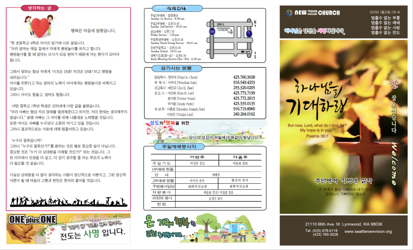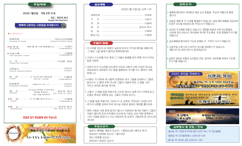 2023년1월22일 주보안내 페이지 정보 작성자 뉴비전교회 조회 413회 작성일 23-01-30 08:21 목록 본문 2023년1월22일 주보안내 이전글2023년1월29일주보안내 23.01.30 다음글2023년1월15일 주보안내 23.01.30
