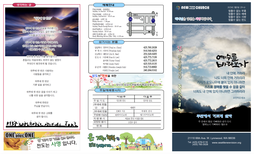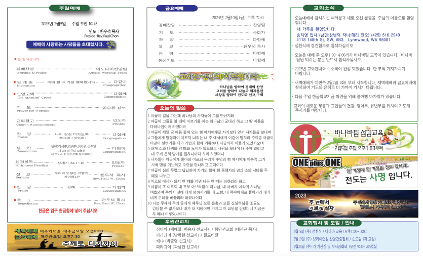 2023년2월5일 주보안내 페이지 정보 작성자 뉴비전교회 조회 431회 작성일 23-02-13 07:37 목록 본문 2023년2월5일 주보안내 이전글2023년2월12일 주보안내 23.02.13 다음글2023년1월29일주보안내 23.01.30