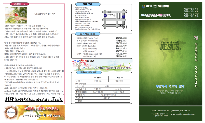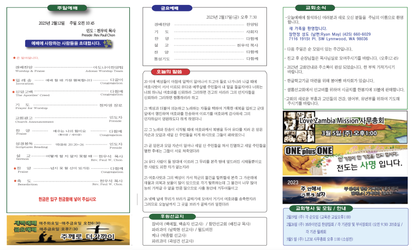 2023년2월12일 주보안내 페이지 정보 작성자 뉴비전교회 조회 638회 작성일 23-02-13 07:39 목록 본문 2023년2월12일 주보안내 이전글2023년2월19일 주보안내 23.03.19 다음글2023년2월5일 주보안내 23.02.13