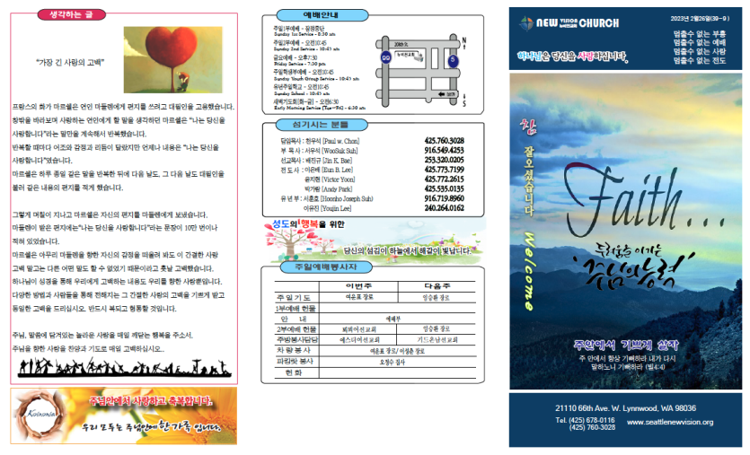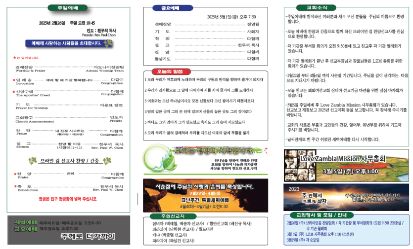 2023년2월26일 주보안내 페이지 정보 작성자 뉴비전교회 조회 381회 작성일 23-03-19 07:39 목록 본문 2023년2월26일 주보안내 이전글2023년3월5일 주보안내 23.03.19 다음글2023년2월19일 주보안내 23.03.19