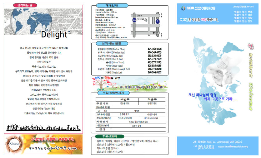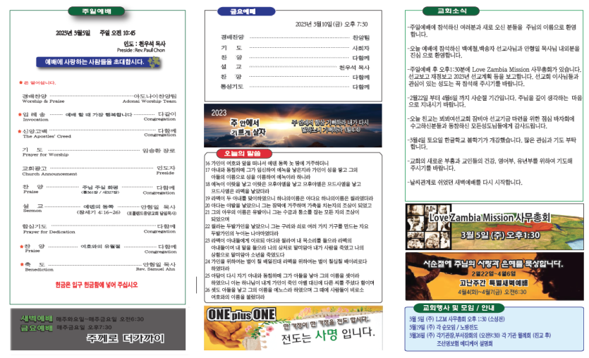 2023년3월5일 주보안내 페이지 정보 작성자 뉴비전교회 조회 461회 작성일 23-03-19 07:44 목록 본문 2023년3월5일 주보안내 이전글2023년3월12일 주보안내 23.03.19 다음글2023년2월26일 주보안내 23.03.19