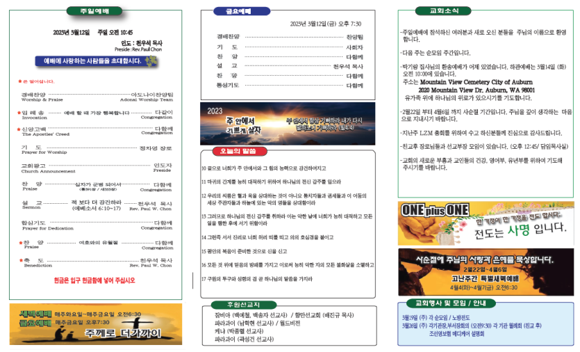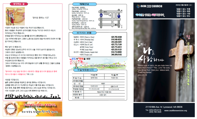 2023년3월12일 주보안내 페이지 정보 작성자 뉴비전교회 조회 363회 작성일 23-03-19 07:46 목록 본문 2023년3월12일 주보안내 이전글2023년3월19일 주보안내 23.03.19 다음글2023년3월5일 주보안내 23.03.19