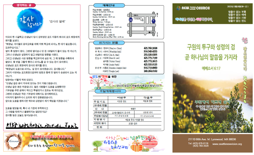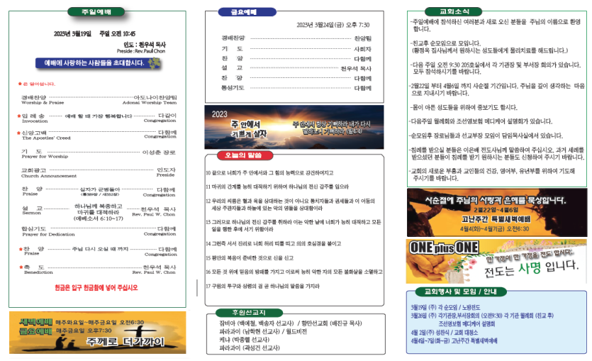 2023년3월19일 주보안내 페이지 정보 작성자 뉴비전교회 조회 467회 작성일 23-03-19 07:55 목록 본문 2023년3월19일 주보안내 이전글2023년3월26일 주보안내 23.04.02 다음글2023년3월12일 주보안내 23.03.19