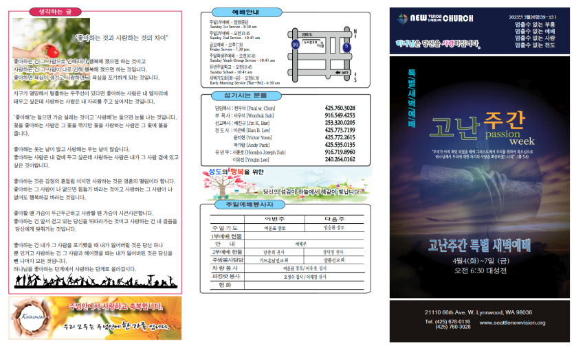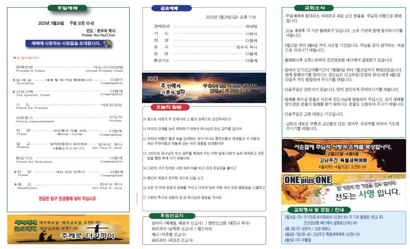2023년3월26일 주보안내 페이지 정보 작성자 뉴비전교회 조회 372회 작성일 23-04-02 07:59 목록 본문 2023년3월26일 주보안내 이전글2023년4월2일 주보안내 23.04.02 다음글2023년3월19일 주보안내 23.03.19