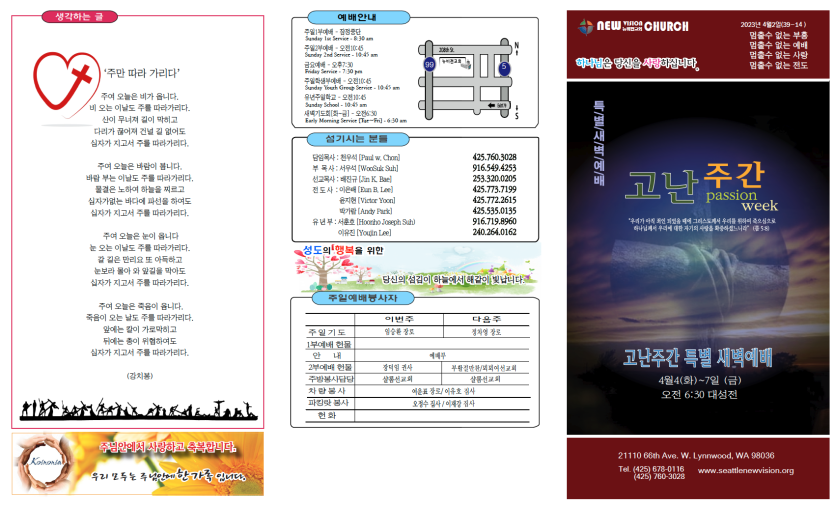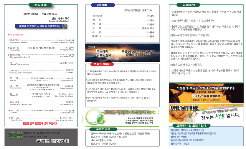 2023년4월2일 주보안내 페이지 정보 작성자 뉴비전교회 조회 390회 작성일 23-04-02 08:01 목록 본문 2023년4월2일 주보안내 이전글2023년4월9일 주보안내 23.04.09 다음글2023년3월26일 주보안내 23.04.02