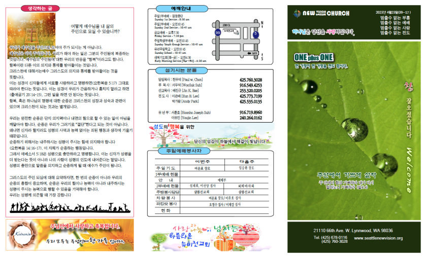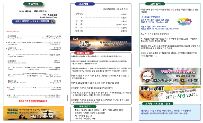 2023년4월23일 주보안내 페이지 정보 작성자 뉴비전교회 조회 384회 작성일 23-04-23 07:08 목록 본문 2023년4월23일 주보안내 이전글2023년4월30일 주보안내 23.04.30 다음글2023년4월16일 주보안내 23.04.23