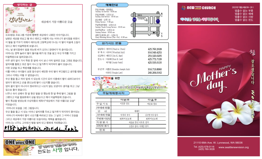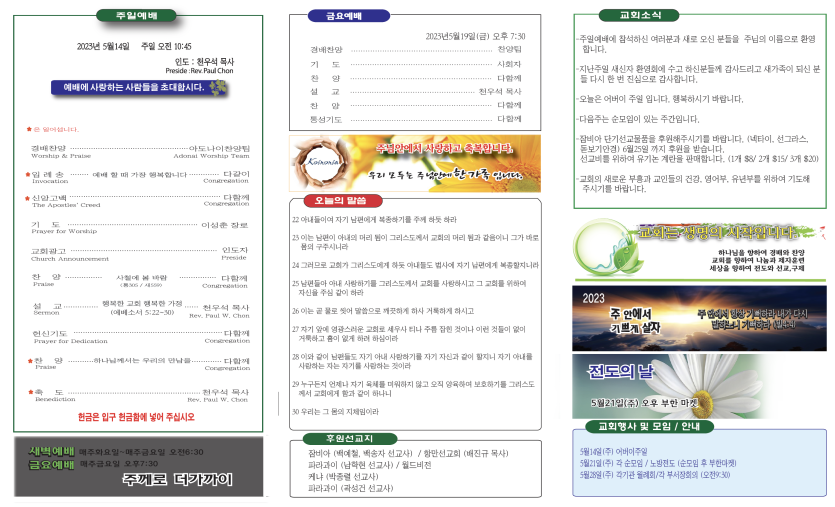 2023년5월14일 주보안내 페이지 정보 작성자 뉴비전교회 조회 360회 작성일 23-05-14 08:35 목록 본문 2023년5월14일 주보안내 이전글2023년5월21일 주보안내 23.05.21 다음글2023년5월7일 주보안내 23.05.14