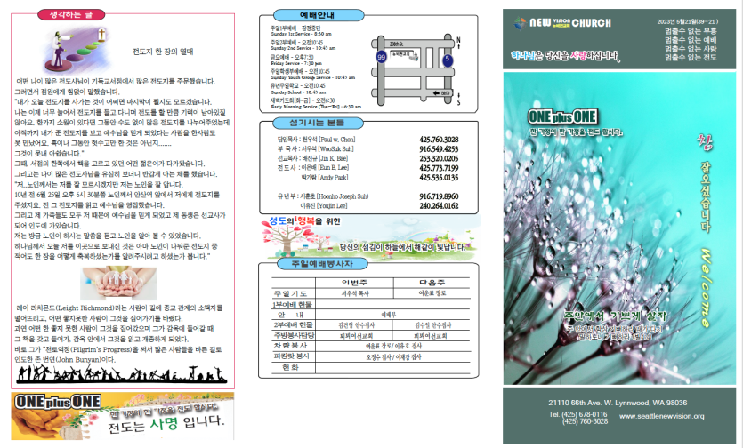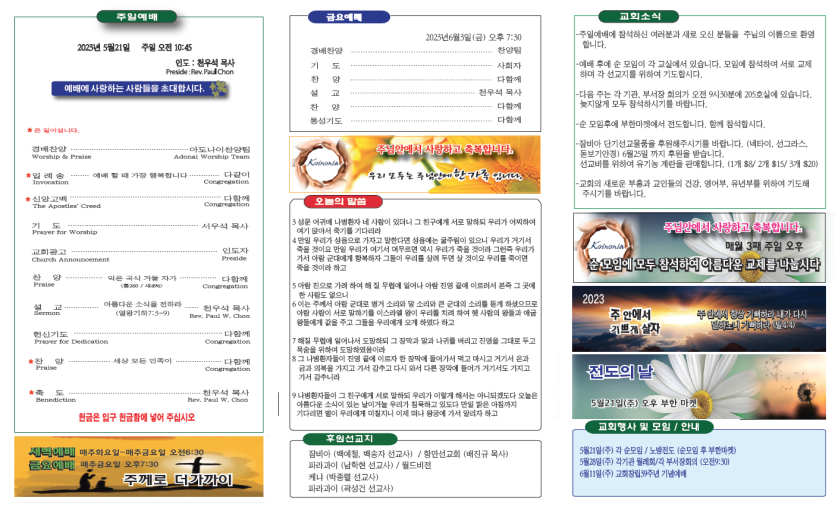 2023년5월21일 주보안내 페이지 정보 작성자 뉴비전교회 조회 373회 작성일 23-05-21 08:20 목록 본문 2023년5월21일 주보안내 이전글2023년 5월28일 주보안내 23.06.18 다음글2023년5월14일 주보안내 23.05.14