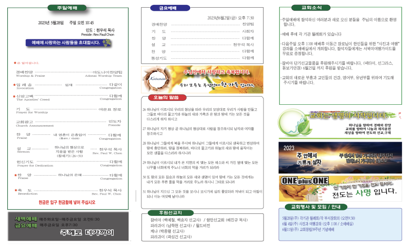 2023년 5월28일 주보안내 페이지 정보 작성자 뉴비전교회 조회 367회 작성일 23-06-18 08:24 목록 본문 2023년 5월28일 주보안내 이전글2023년 6월4일 주보안내 23.06.18 다음글2023년5월21일 주보안내 23.05.21